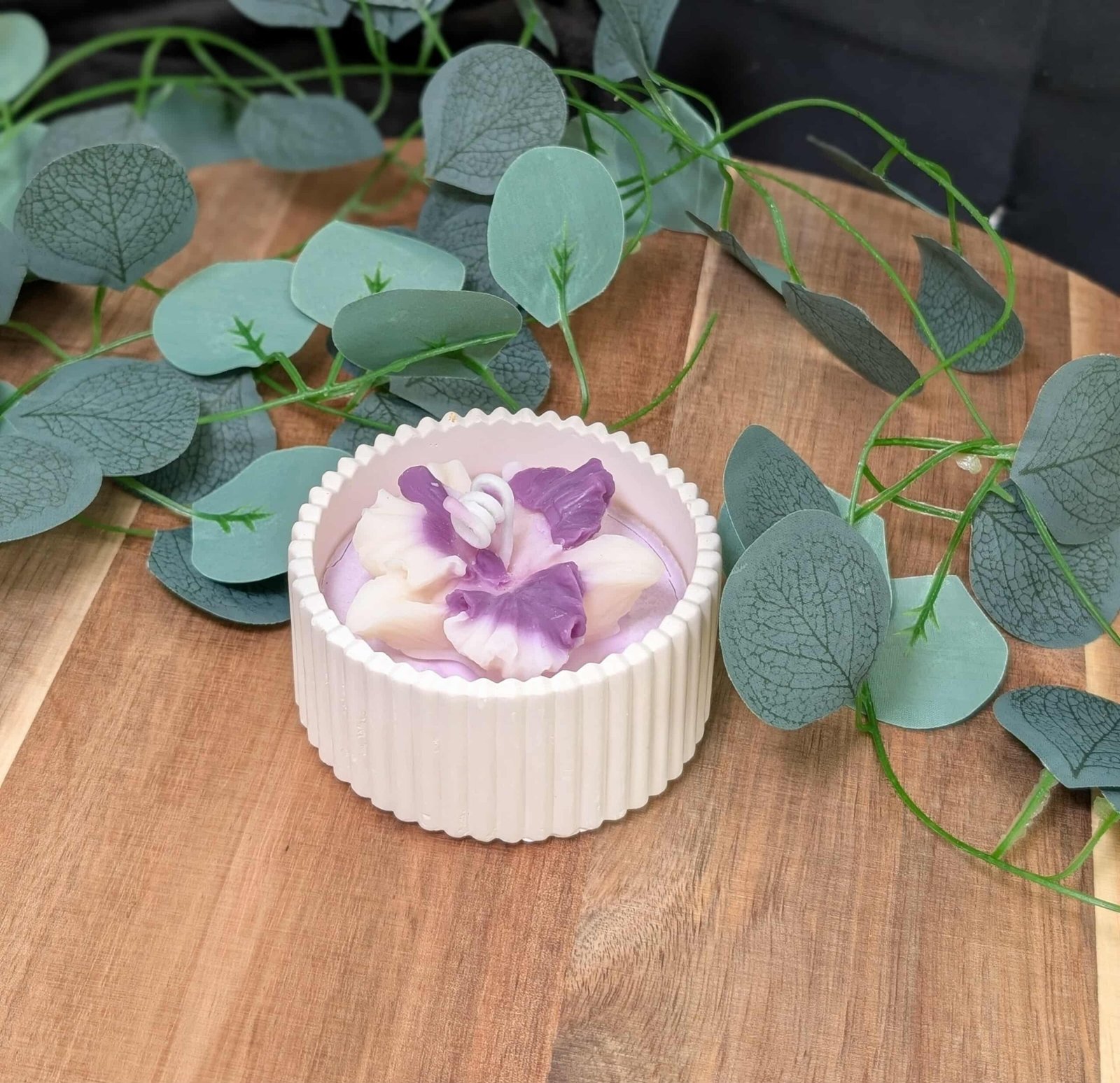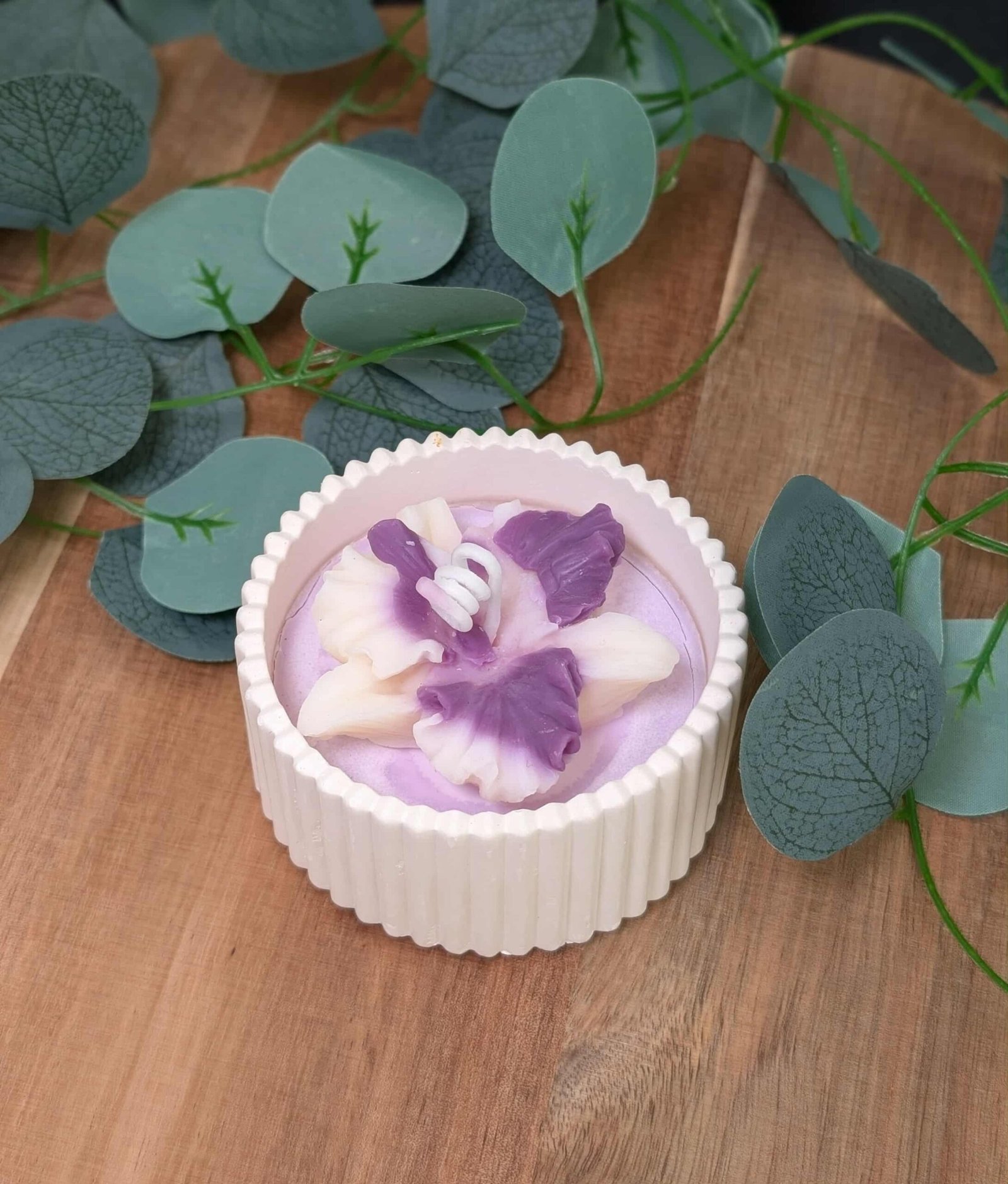 Un bijou artisanal : contenant en plâtre fait main, cire de soja au parfum sucré de bonbon violette et délicate orchidée en cire de colza pour la touche florale.