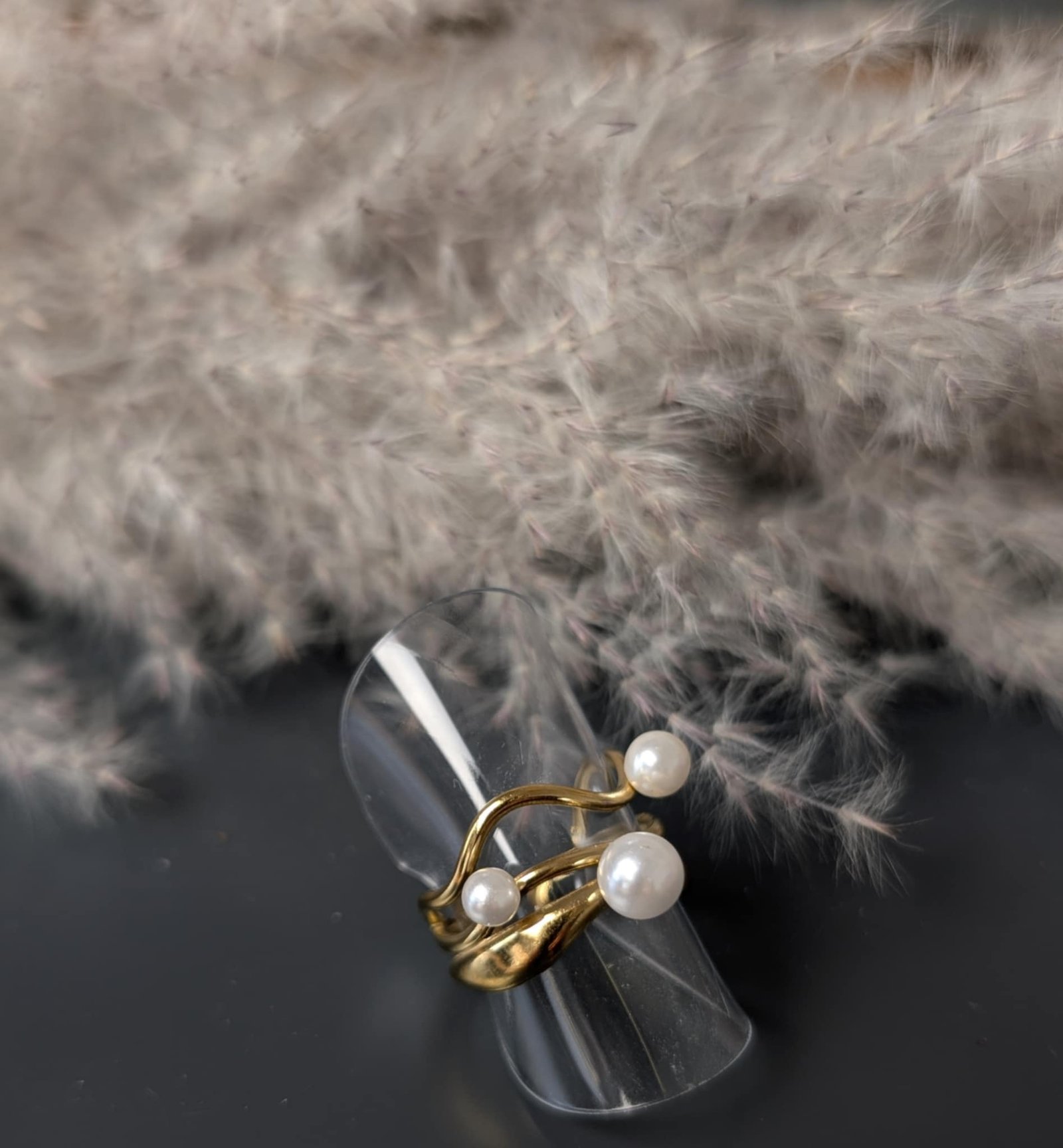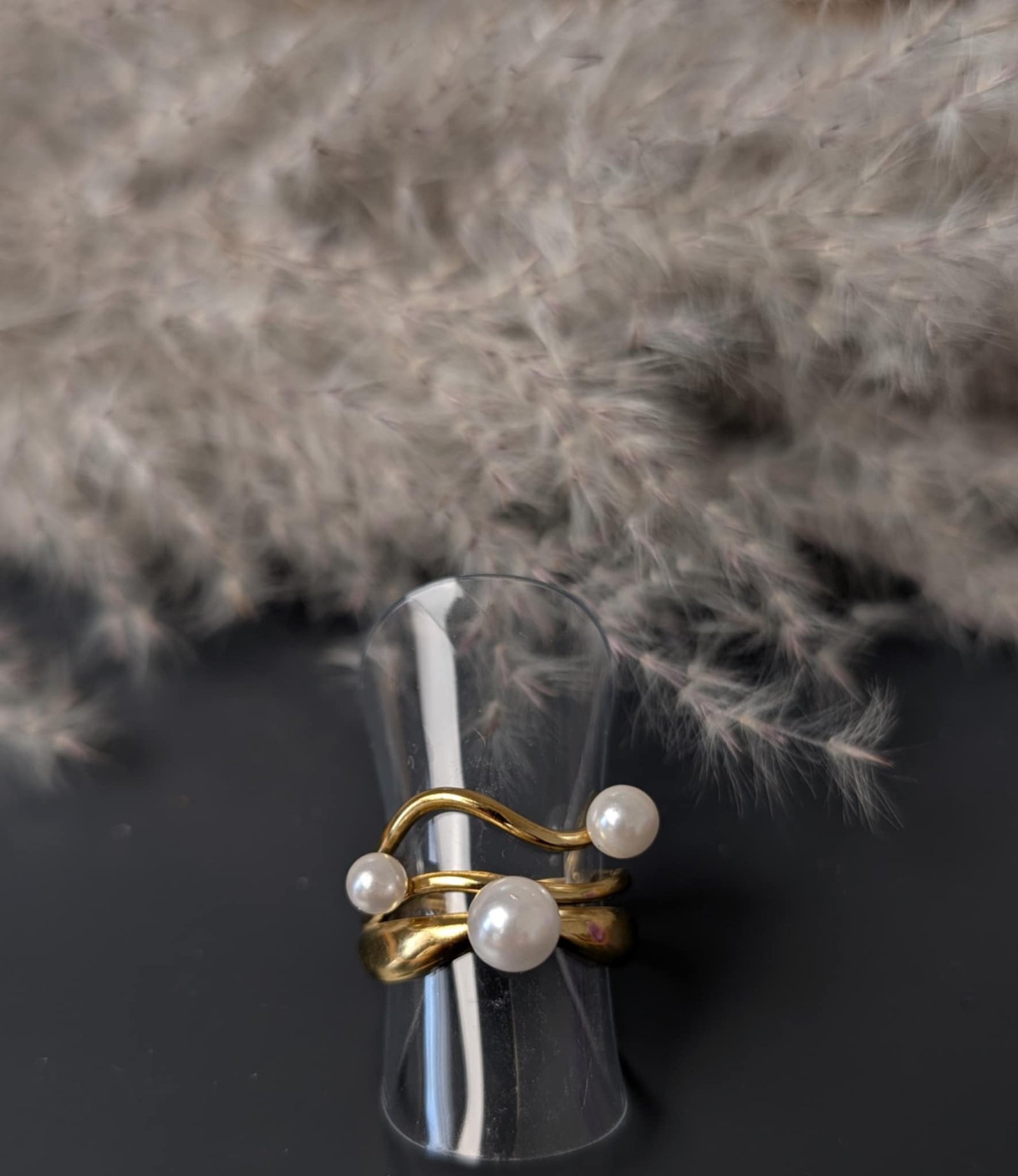 Bague Dorée Ligne Vagues avec Perle. Réglable