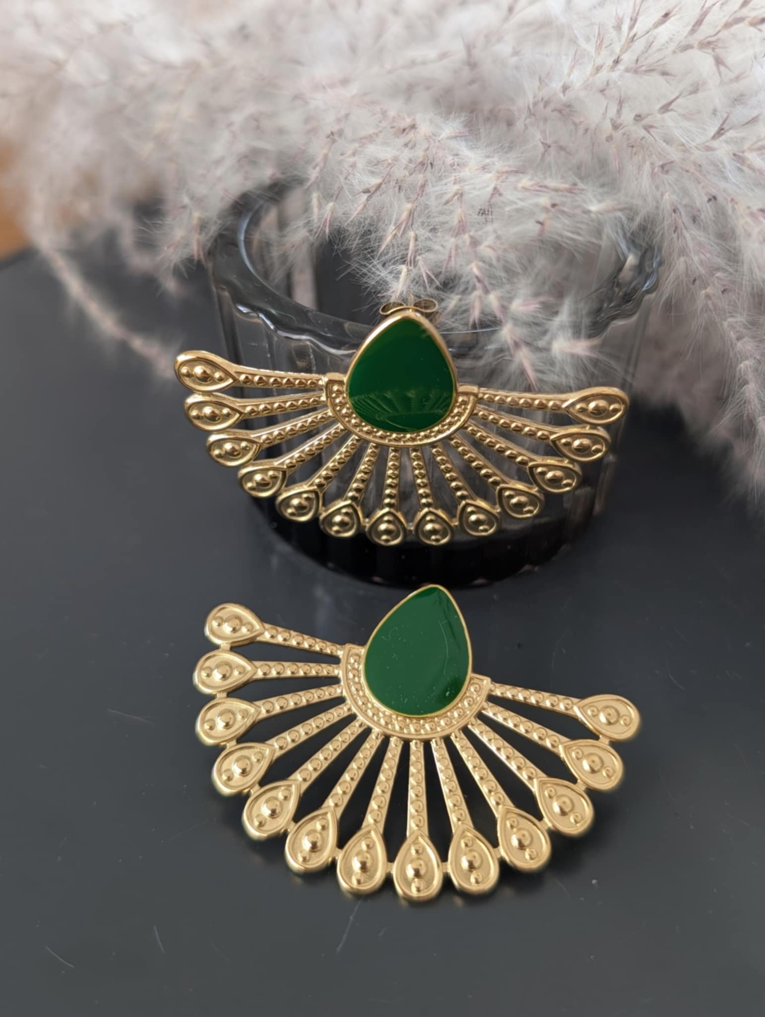 Boucles d’Oreilles Dorées Demi Fleur avec Goutte Verte.