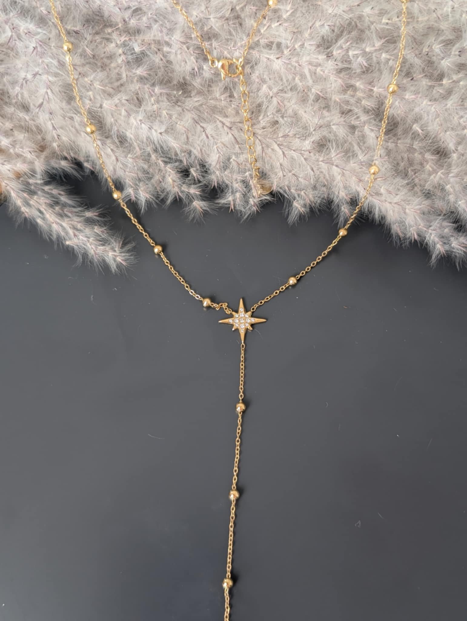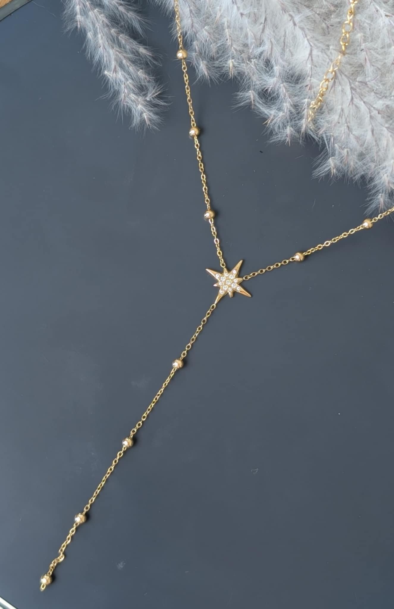 Collier Chaîne Y Dorée Étoile Scintillante Avec Strass Et Perles. En doré.