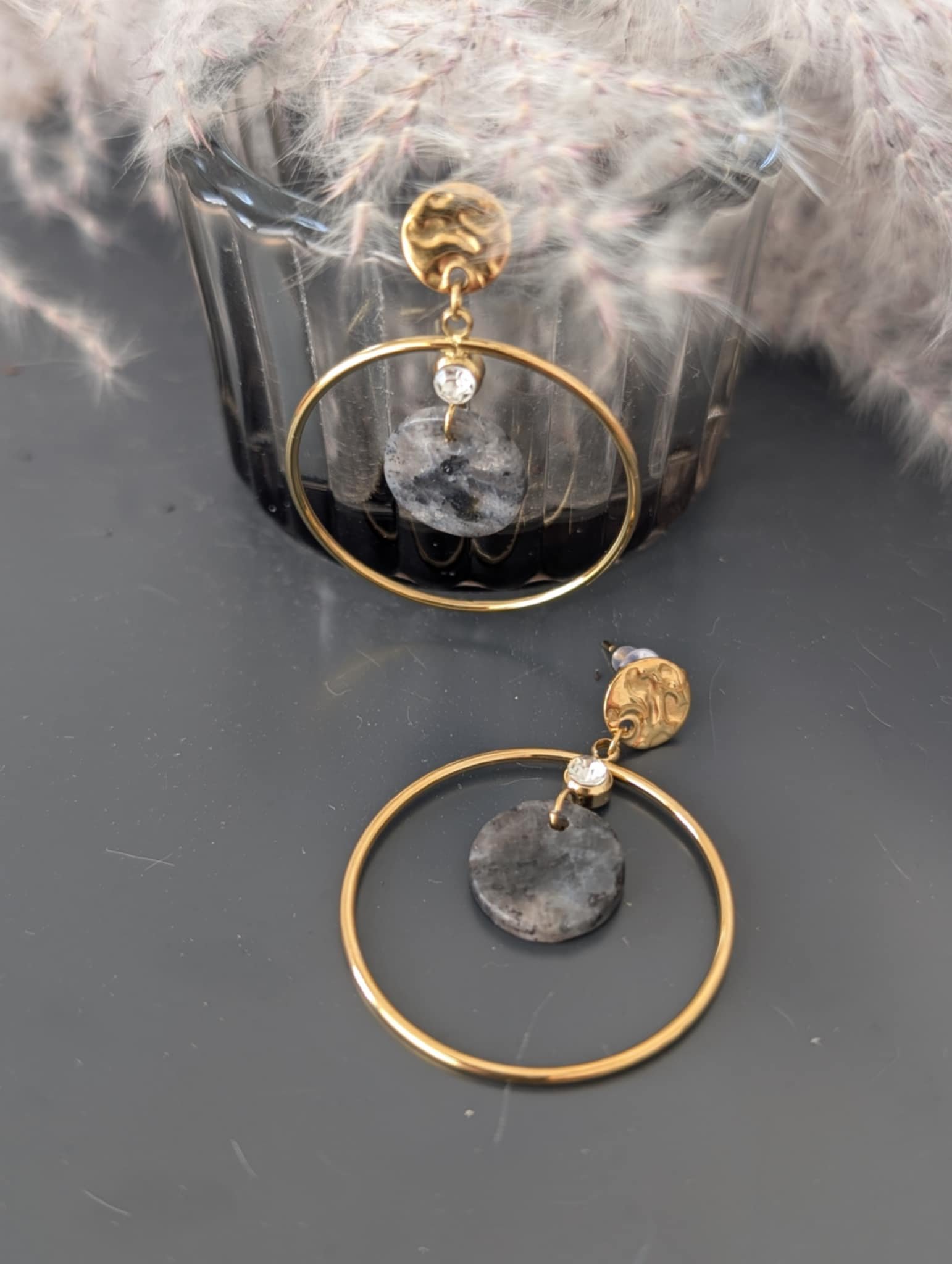Créoles doré avec plaques rondes Noires et strass